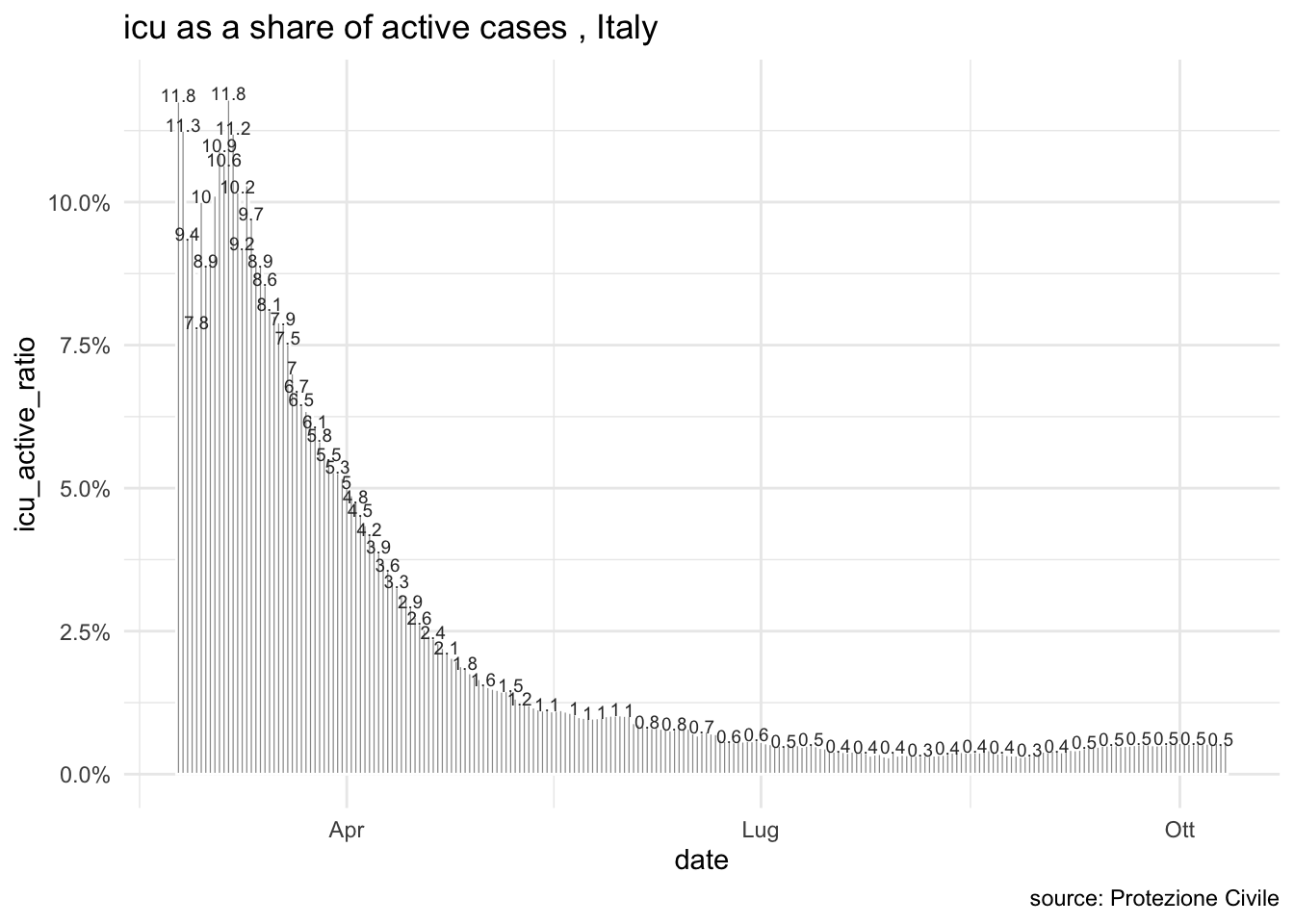 ggplot(aes(x = date,y = icu_active_ratio, label = round(icu_active_ratio,3)*100))+